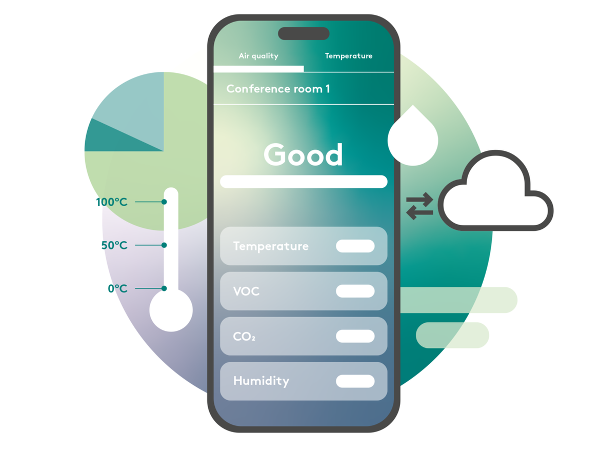 Um den Benutzern zu versichern, dass sie von gesunder Luft umgeben sind, zeigt die App den Status verschiedener Parameter wie CO2, VOC und Luftfeuchtigkeit an. Die Werte für jeden Parameter wird durch ein deutliches Schlüsselwort dargestellt, das anzeigt, ob der Wert gesund ist oder nicht. Klicken Sie auf den Parameter, um weitere Informationen über ihn zu lesen, betrachten Sie die Schwellen und bekommen Sie Hinweise, wie sie die Raumklimaqualität verbessern können. Die in der App anzeigbaren Parameter hängen von der Art der im Raum installierten Sensoren ab.