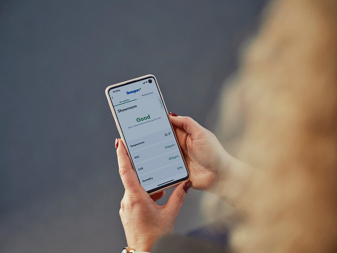 Die WISE Room Control von Swegon ist ein zusätzlicher Service zu unserem Swegon WISE-System für ein bedarfsgesteuertes Raumklima. Die App zeigt das aktuelle Raumklima durch Visualisierung einer Auswahl an Parametern an, z. B. Temperatur und Luftqualität. Im Gebäude anwesende Personen mit Zugriff auf die App haben die Möglichkeit, Temperaturanpassungen innerhalb einer zuvor im WISE-System festgelegten Spanne von wenigen Grad vorzunehmen.