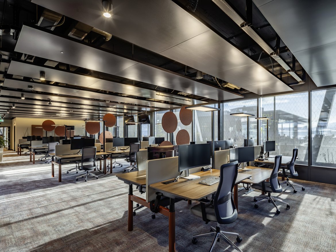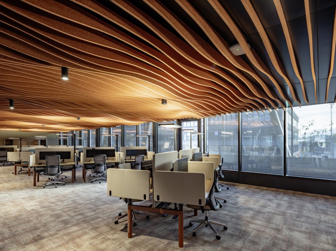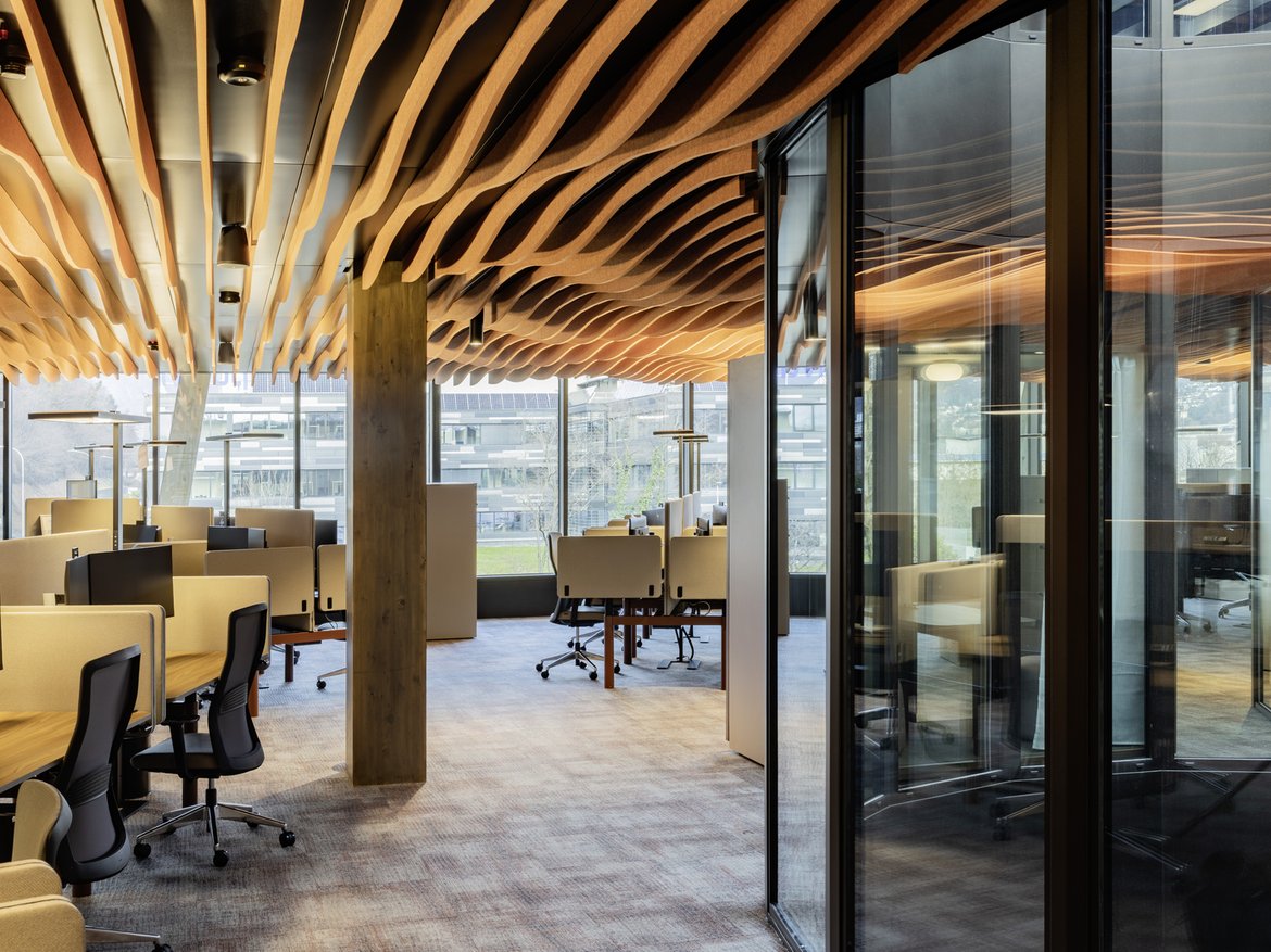 Die Grossraumbüros sind mit einer Kombination aus A11-S Klimadeckensegeln, dem CAURUS Hybridsystem sowie ADRIATIC Kühlbalken von Swegon ausgestattet. In einem Grossraumbüro wurden aufgrund der sehr hohen Kühllasten ADRIATIC Kühlbalken von Swegon oberhalb der Kühlsegel unsichtbar installiert. Diese Systemlösungen sorgen für eine ausgeglichene Raumtemperierung und bieten gleichzeitig hohe Flexibilität in der Flächennutzung.